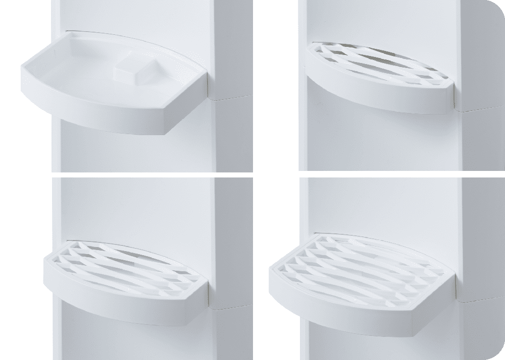 引き出し式水受け皿を採用し、用途に応じて3段階に引き出して使用できるようにしました。水受け皿の内部形状が哺乳瓶や口の狭いボトルに給水する際のガイドとなり、不意なやけど等の事故を防ぎます。また、最小サイズでも給水口直下までしっかりカバーします。